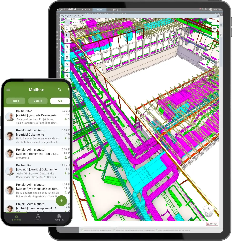 BIM (Building Information Modeling) ermöglicht es, Bauprojekte digital zu planen, zu koordinieren und zu steuern. Mit projectnetworld nutzen Sie BIM-Modelle direkt in Ihrer Bauprojektmanagement Software – ohne zusätzliche Spezialtools.